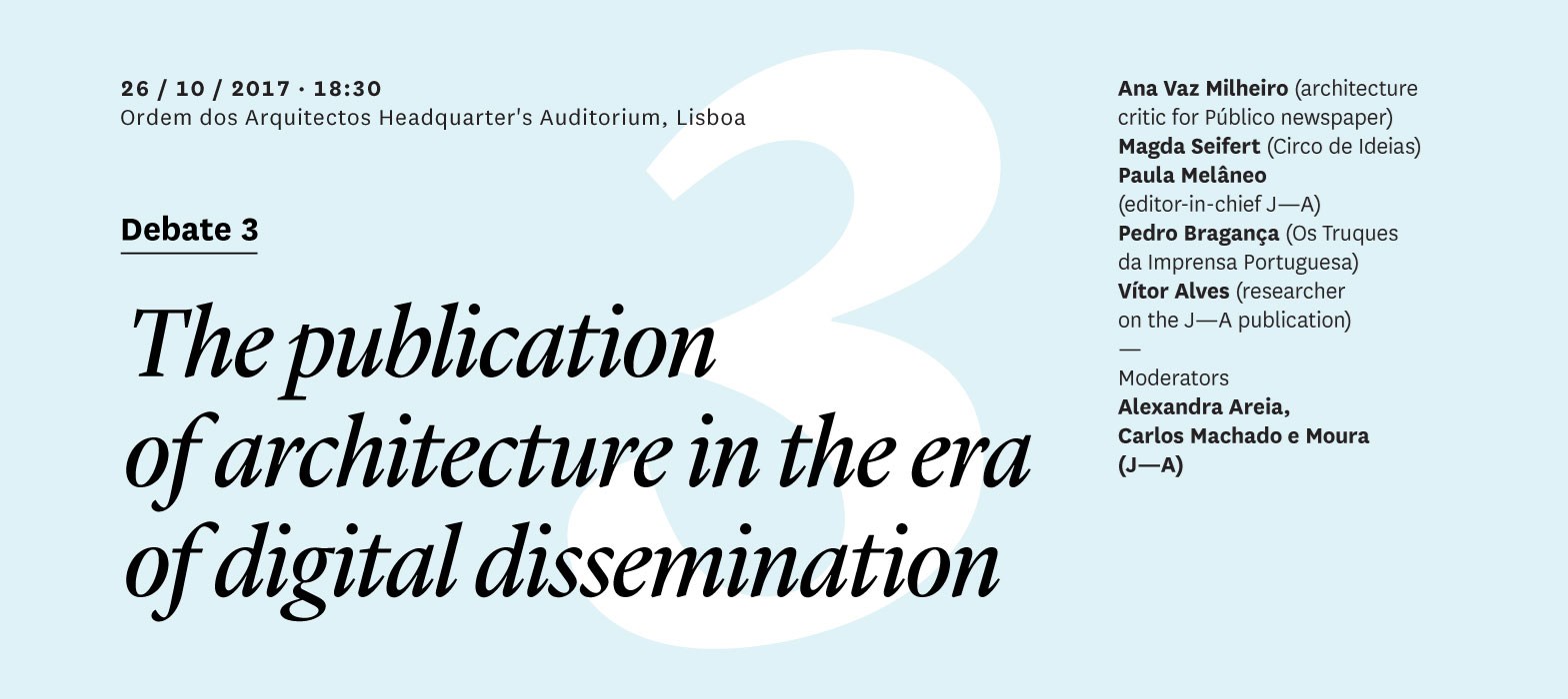 Transposing the debate to the general press, Pedro Bragança – researcher and one of the authors of the website Truques da Imprensa Portuguesa – explained the main reasons for the crisis of the business model used in the traditional press and emphasised the different timing of publications, between digital's immediacy and the elongated time for publishing on paper. He also questioned the sustainability of business models supported by advertising, contrary to the myth that a printed publication is more expensive than an online edition. Vítor Alves – a researcher who has been conducting a study on the history of J—A between 1981-2015 – drew the evolution of the magazine and the vocation of the various series, reflecting on J—A's exceptional character in the landscape of architectural press of professional associations and discussing the relevance of publishing projects to the myriad of platforms currently in existence.