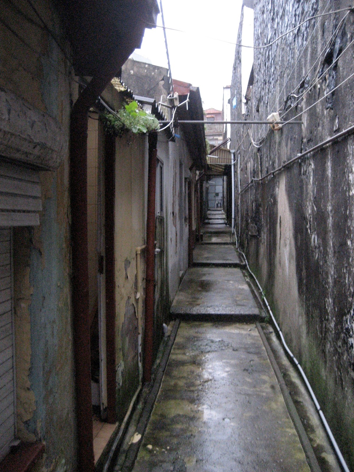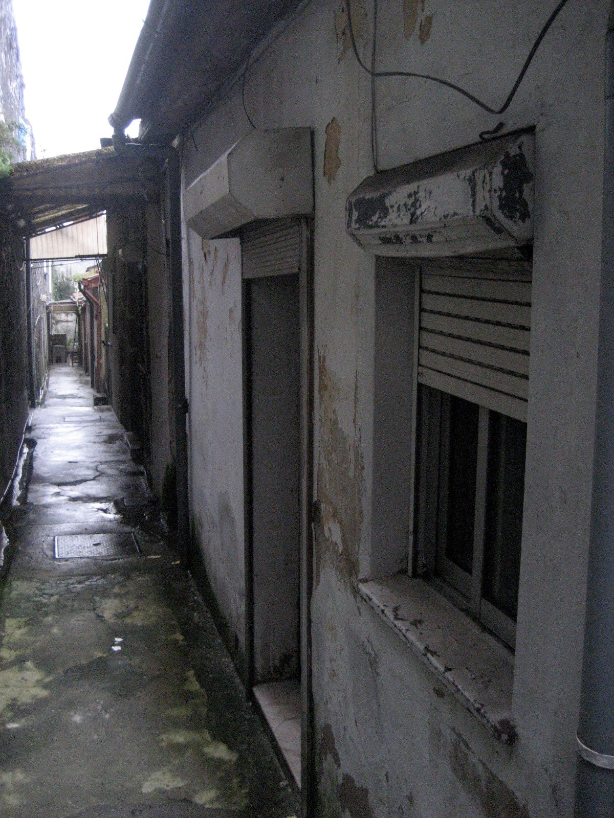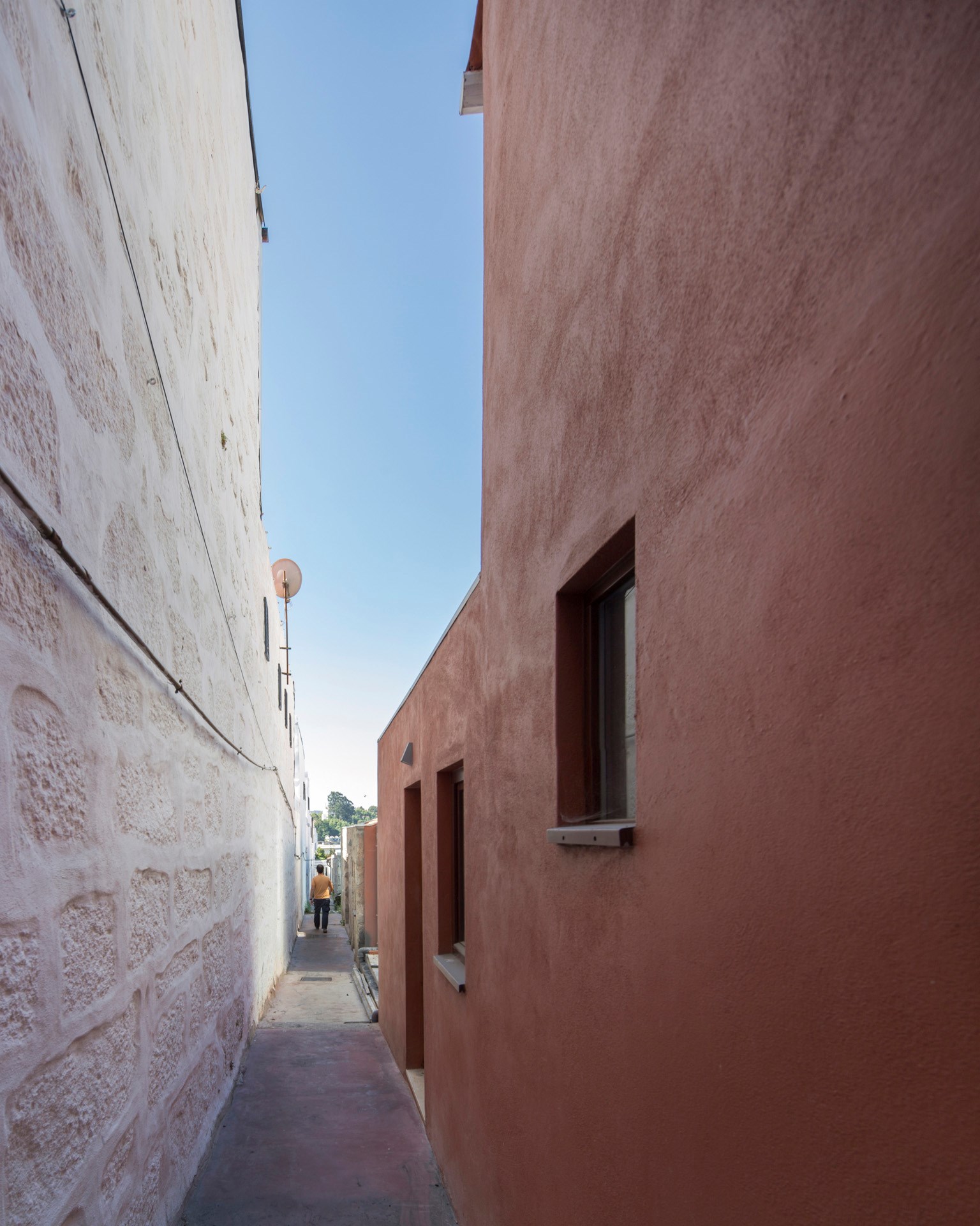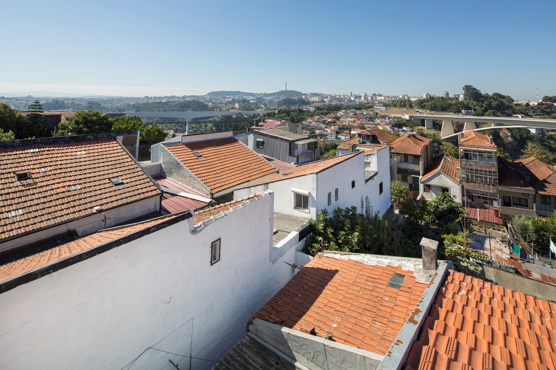 O lote tem 5,75m de largura e 60m de comprimento. A rua interior, com cerca de 1,40m de largura e um desnível de 4m desde a entrada, dava acesso a 8 casas de 14m2. Analisando os sistemas construtivos e plantas antigas encontrámos pátios entre cada duas casas, que foram, entretanto, ocupados com ampliações e anexos. Este desenho foi recuperado, devolvendo os pátios às habitações, permitindo desfazer o efeito de corredor da rua interna, e utilizar os mesmos como espaços de entrada nas casas. Desta forma, procuramos promover um espaço intersticial, entre a rua interna e a casa, potenciando uma zona exterior habitável, como um pequeno jardim ou alpendre.